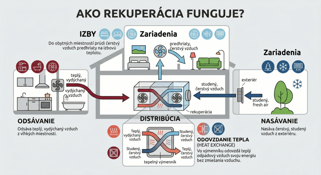 Odsávanie: Ventilátor odčerpáva teplý, vydýchaný vzduch z „vlhkých“ miestností (kuchyňa, kúpeľňa, WC).